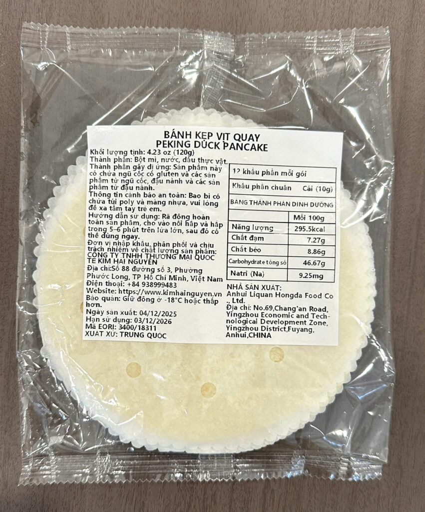 Bánh kẹp vịt quay được sản xuất từ các nguyên liệu chọn lọc gồm bột mì, nước và dầu thực vật, phối trộn theo công thức phù hợp nhằm tạo nên lớp bánh mỏng, mềm và có độ dẻo vừa phải. Quá trình cán và tạo hình được kiểm soát kỹ lưỡng giúp bánh có độ dày đồng đều, bề mặt mịn và hạn chế nứt gãy trong quá trình sử dụng.
