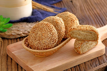 Bánh nướng sốt mè được làm từ bột mì kết hợp cùng bơ đậu phộng và mè trắng, tạo nên hương vị béo thơm đặc trưng. Lớp bánh được phủ mè trên bề mặt, giúp tăng mùi hương và độ hấp dẫn sau khi nướng.